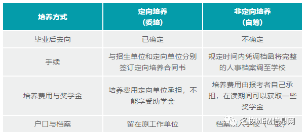 2.非定向培养(自筹):在录取的时候并不确定毕业后的去向。此类学员进修主要是为了提升自己的能力,其培养费用由报考者自己承担。毕业后再按照自己的需求进行择业。非定向生培养费一些部分也由中央或地方财政拨款,在读期间可以获取一些奖助学金。