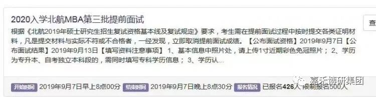 作为涨价的第一年,北航MBA似乎并没有受到“商品价格上升,购买人数减少”的影响。8月15日,是北航MBA第三批提前面试申请系统开放的日期,申请名额500人,学校计划8月25日截止申请,9月2日进行面试。然而,系统开放10分钟不到,500个名额就已经预约满。